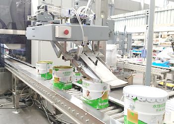 全自動桶裝生產線:包括自動臥式分桶、4頭自動定量灌裝、自動分蓋上蓋封口、機器人自動碼垛整條全自動生產線