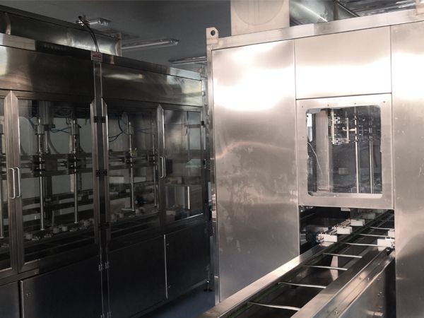 灌裝系統采用人工上桶,自動排列輸送,系統自動灌裝,通過理蓋機自動上蓋,旋蓋機自動旋蓋,輸送過程中貼標機自動完成貼標,貼標完成通過鏈板輸送機輸送入庫。